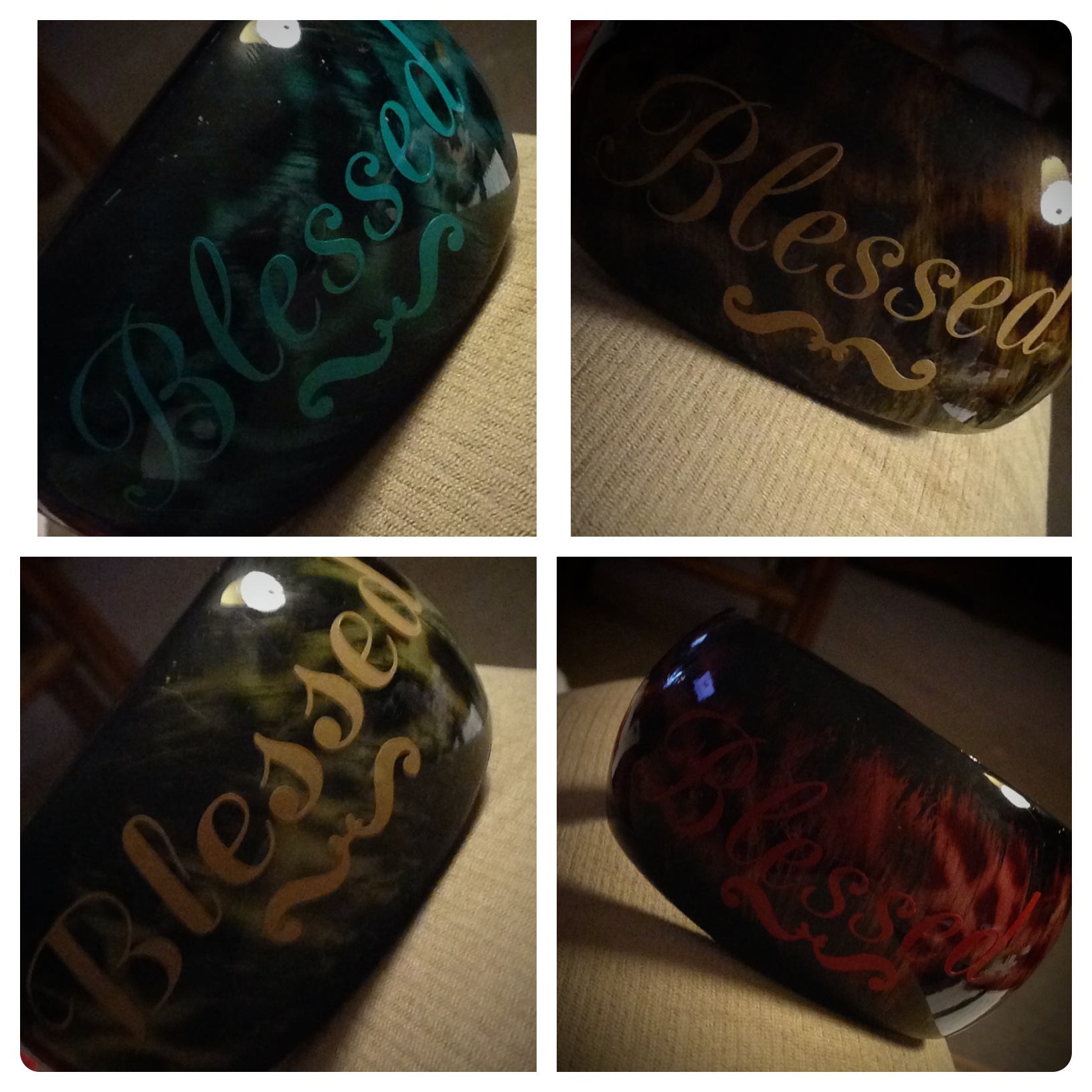I received a new shipment of bangle bracelets yesterday and I am so excited to show them to you. They are a rich jewel tones combined with black to make a very nice animal print. I couldn’t wait to turn a few of them into my “Blessed” bracelets. These are a bit different in shape as well. The band is graduated to where it is thinner on the back side. They are also a hinged a design. They fit a normal to to small size wrist very well.